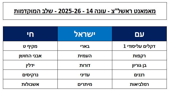 | שעה | מגרש | קבוצה א' | קבוצה ב' | מע' 1 | מע' 2 | מע' 3 | סה"כ | תוצאה |