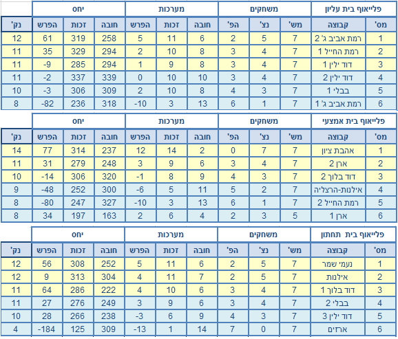 | שעה | מגרש | קבוצה א' | קבוצה ב' | מע' 1 | מע' 2 | מע' 3 | סה"כ | תוצאה |