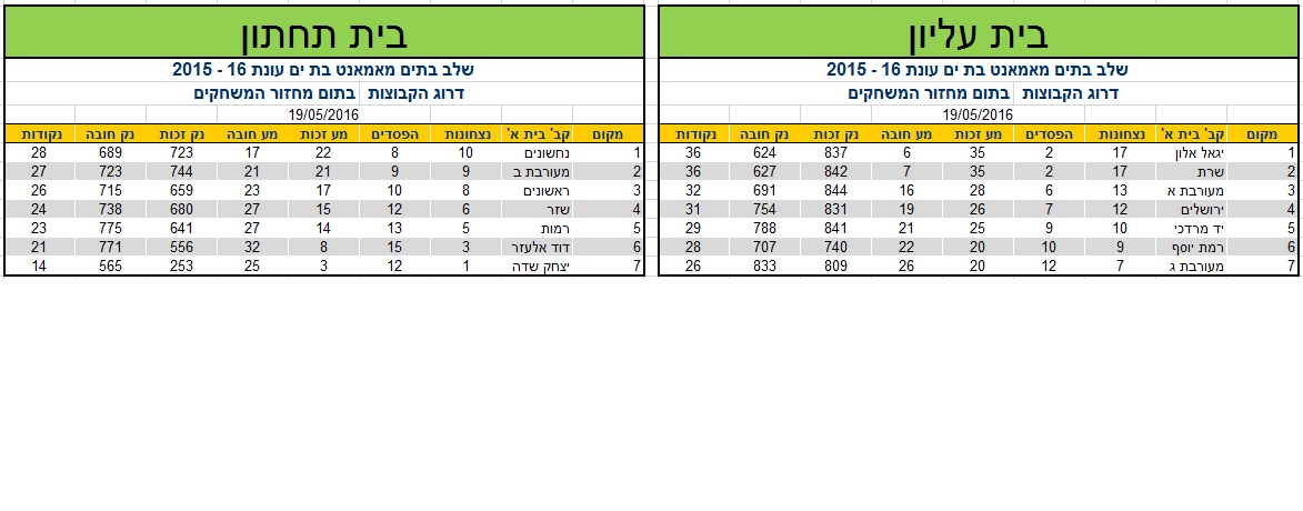| שעה | מגרש | קבוצה א' | קבוצה ב' | מע' 1 | מע' 2 | מע' 3 | סה"כ | תוצאה |