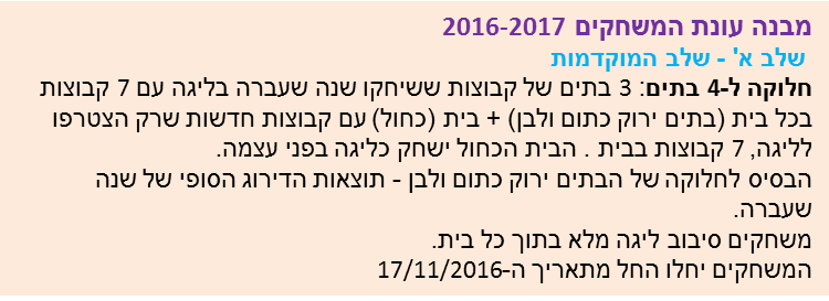 | שעה | מגרש | קבוצה א' | קבוצה ב' | מע' 1 | מע' 2 | מע' 3 | סה"כ | תוצאה |