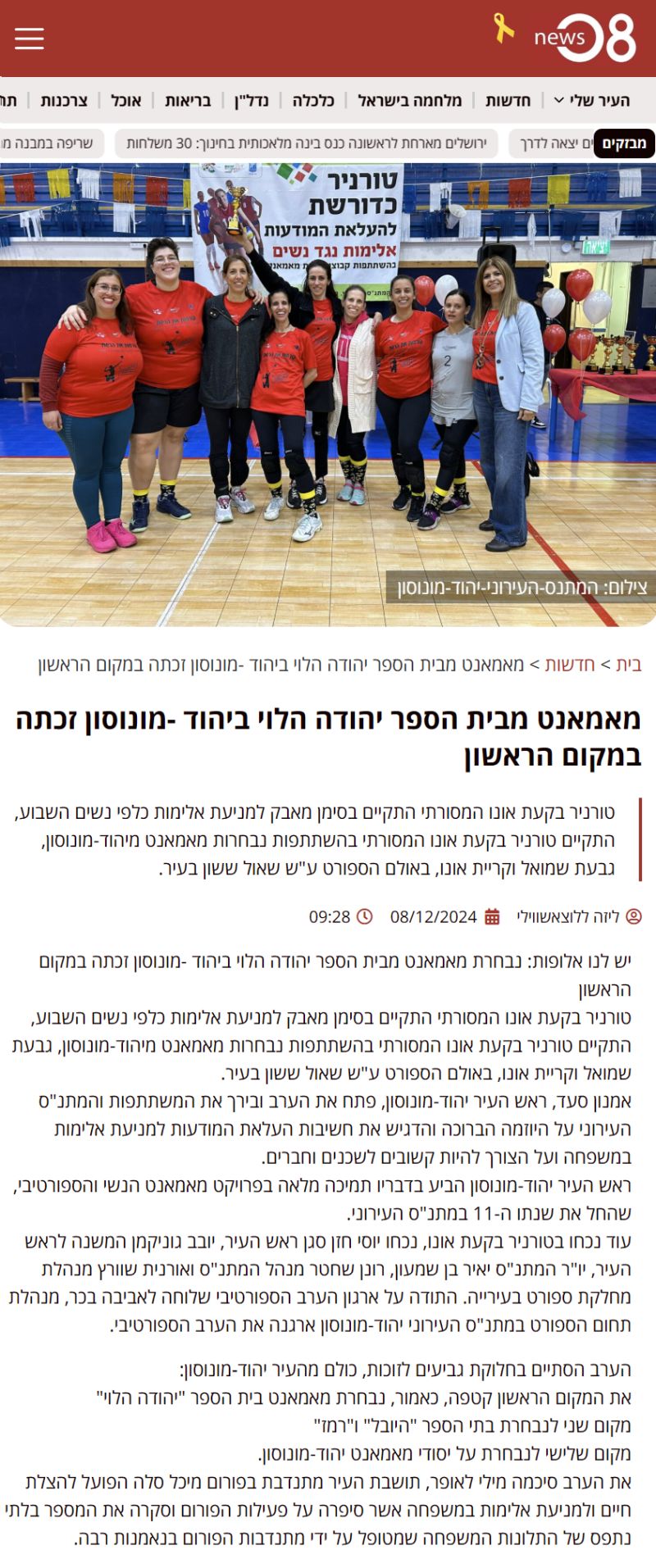 טורניר בקעת אונו המסורתי התקיים בסימן מאבק למניעת אלימות כלפי נשים השבוע, התקיים טורניר בקעת אונו המסורתי בהשתתפות נבחרות מאמאנט מיהוד-מונוסון, גבעת שמואל וקריית אונו, באולם הספורט ע"ש שאול ששון בעיר.