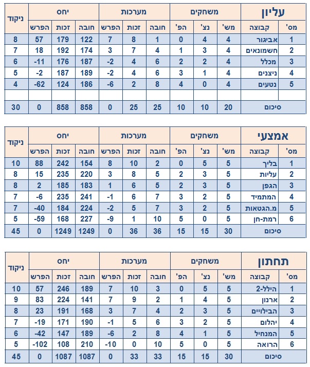 | שעה | מגרש | קבוצה א' | קבוצה ב' | מע' 1 | מע' 2 | מע' 3 | סה"כ | תוצאה |
