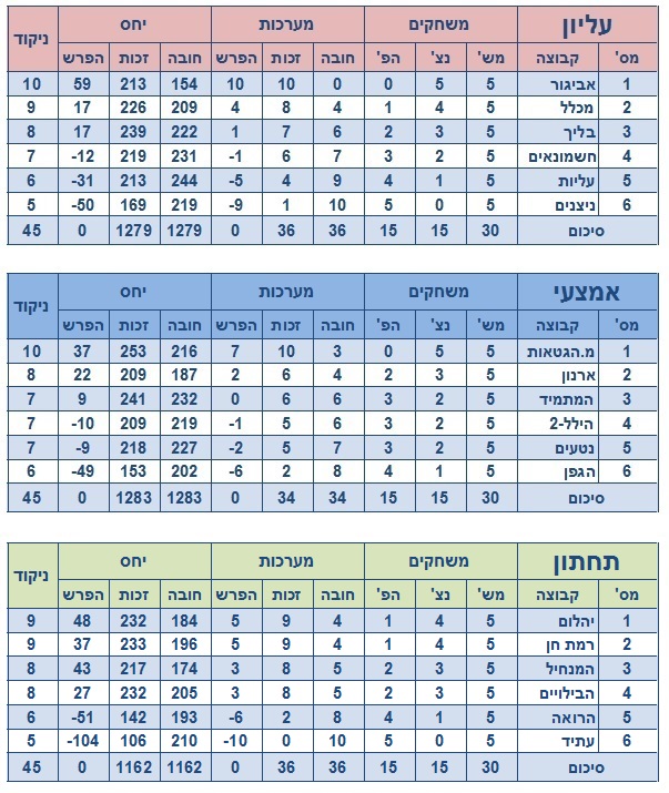 | שעה | מגרש | קבוצה א' | קבוצה ב' | מע' 1 | מע' 2 | מע' 3 | סה"כ | תוצאה |