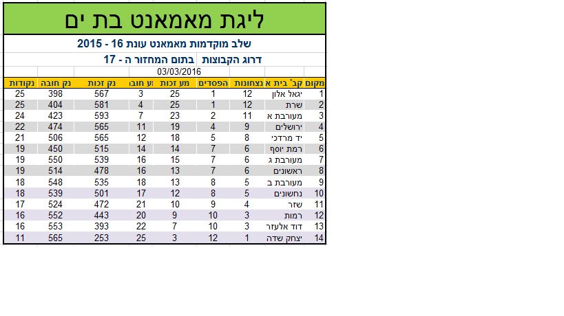 | שעה | מגרש | קבוצה א' | קבוצה ב' | מע' 1 | מע' 2 | מע' 3 | סה"כ | תוצאה |