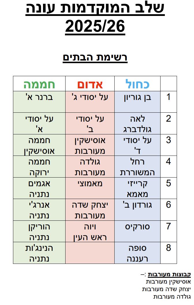 | שעה | מגרש | קבוצה א' | קבוצה ב' | מע' 1 | מע' 2 | מע' 3 | סה"כ | תוצאה |