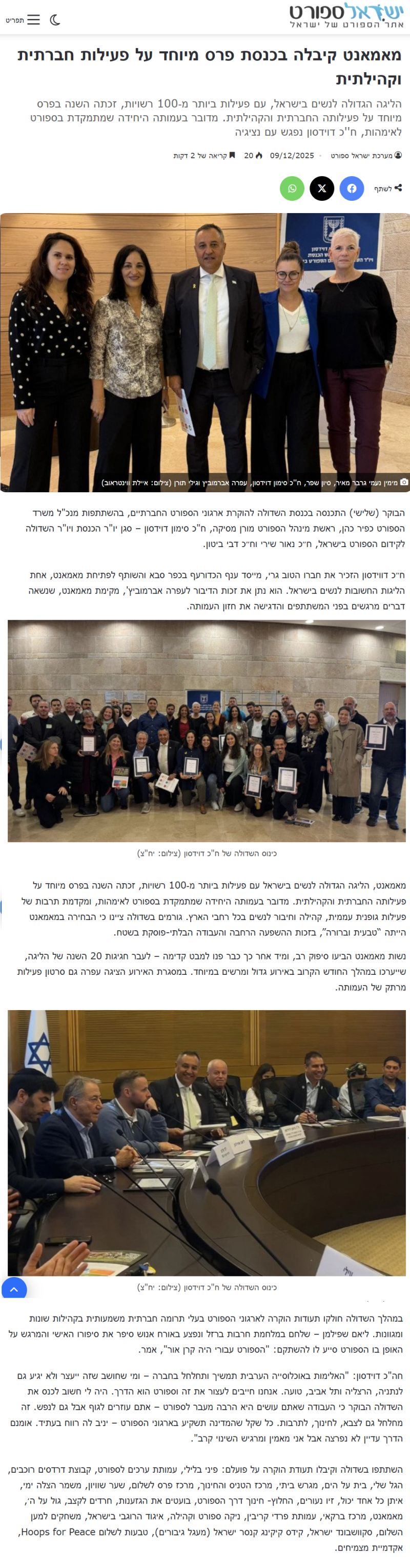 הליגה הגדולה לנשים בישראל, עם פעילות ביותר מ‑100 רשויות, זכתה השנה בפרס מיוחד על פעילותה החברתית והקהילתית. מדובר בעמותה היחידה שמתמקדת בספורט לאימהות, ח''כ דוידסון נפגש עם נציגיה