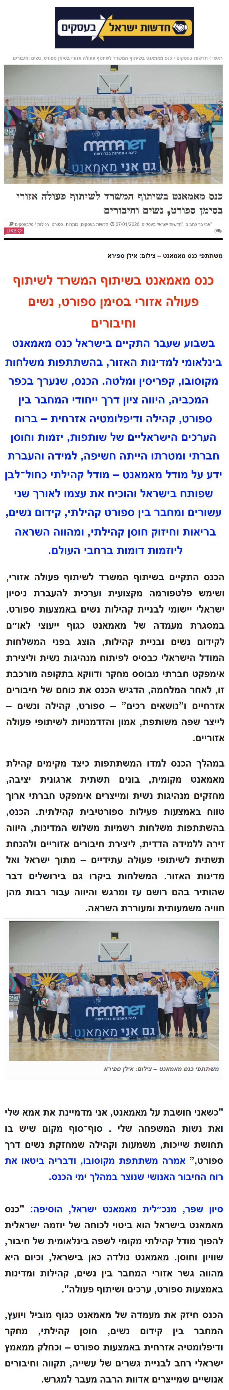 בשבוע שעבר התקיים בישראל כנס מאמאנט בינלאומי למדינות האזור, בהשתתפות משלחות מקוסובו, קפריסין ומלטה. הכנס, שנערך בכפר המכביה, היווה ציון דרך ייחודי המחבר בין ספורט, קהילה ודיפלומטיה אזרחית – ברוח הערכים הישראליים של שותפות, יזמות וחוסן חברתי ומטרתו הייתה חשיפה, למידה והעברת ידע על מודל מאמאנט – מודל קהילתי כחול־לבן שפותח בישראל והוכיח את עצמו לאורך שני עשורים ומחבר בין ספורט קהילתי, קידום נשים, בריאות וחיזוק חוסן קהילתי, ומהווה השראה ליוזמות דומות ברחבי העולם.