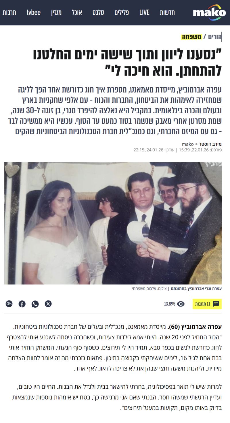עפרה אברמוביץ, מייסדת מאמאנט, מספרת איך חוג כדורשת אחד הפך לליגה שמחזירה לאימהות את הביטחון, החברות והכוח - עם אלפי שחקניות בארץ ובעולם והכרה בינלאומית. במקביל היא נאלצה להיפרד מגרי, בן זוגה ל-30 שנה, שמת מסרטן אחרי מאבק שנשמר בסוד כמעט עד הסוף. עכשיו היא ממשיכה לבד - גם עם המיזם החברתי, וגם כמנכ״לית חברת הטכנולוגיות הביטחוניות שהקים